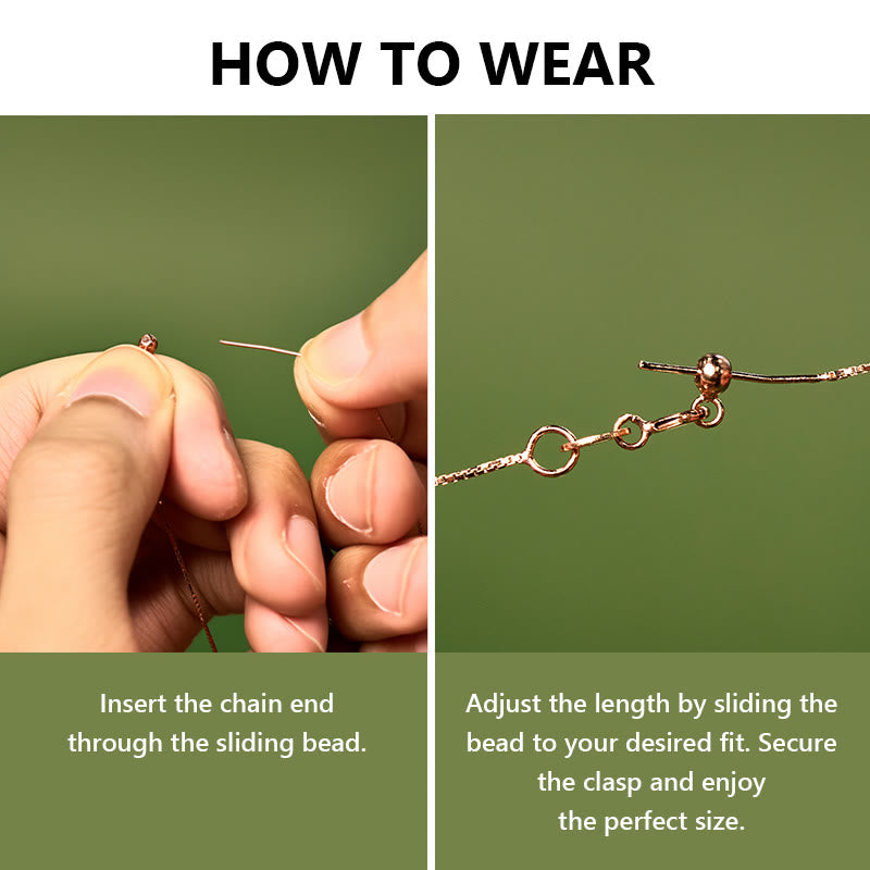 Tenere la perlina scorrevole con una mano e tirare delicatamente le estremità della catena con l'altra mano per stringere o allentare il braccialetto/collana.