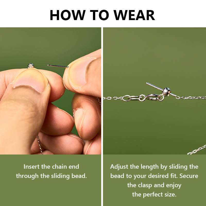 Tenere la perlina scorrevole con una mano e tirare delicatamente le estremità della catena con l'altra mano per stringere o allentare il braccialetto/collana.