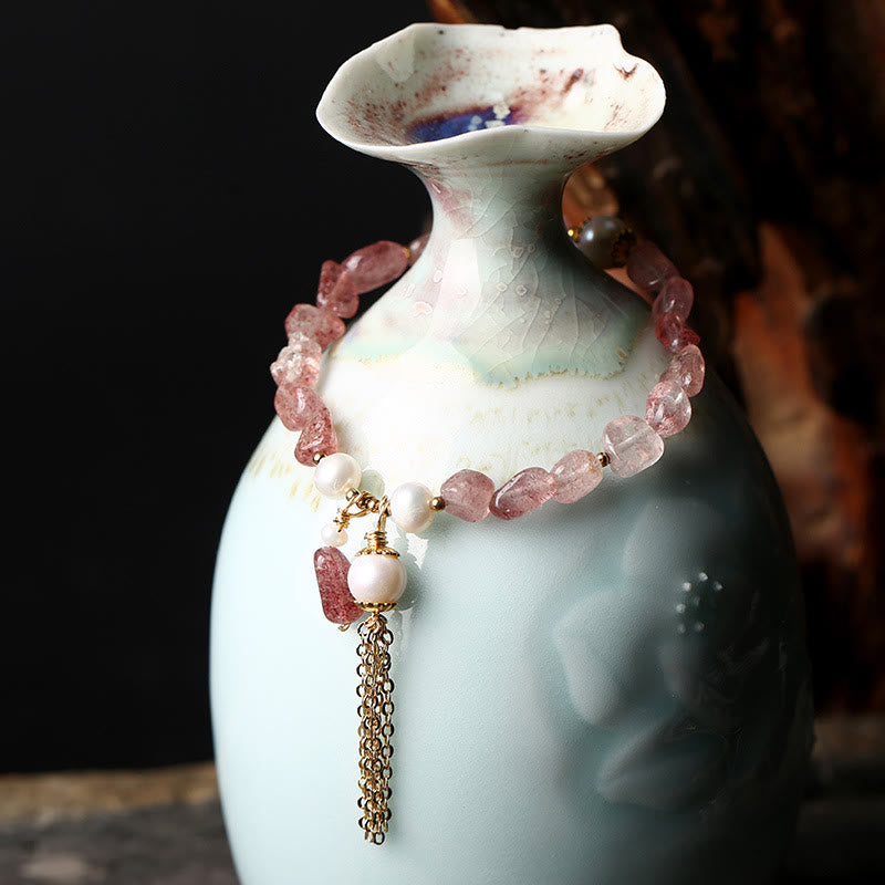 - Materiale: Quarzo fragola, perla, rame placcato oro 14K