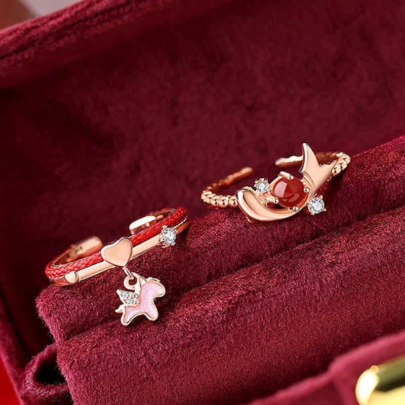 Anello aperto portafortuna in argento sterling 925 con cordino rosso Buddha Stones - Cordino rosso in argento 925 con unicorno dorato (regolabile) - image 1