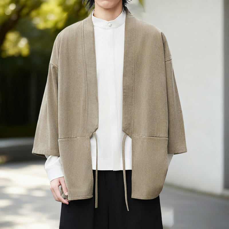 Giacca in velluto a coste a maniche lunghe con apertura frontale e tinta unita Buddha Stones, camicia kimono in cotone e lino da uomo