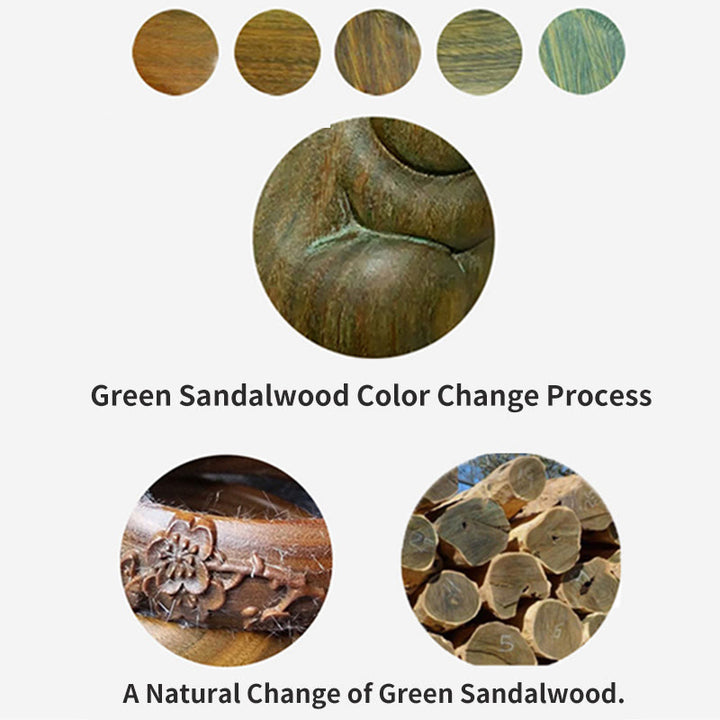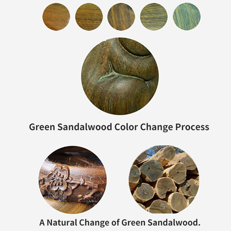 Il colore del sandalo verde è un processo di cambiamento, non un colore fisso. All'inizio, il sandalo verde appena tagliato è generalmente giallastro, e poi si ossida lentamente e diventa verde e più scuro nel tempo. Ci sono giallo, marrone, verde, ecc., in diverse fasi, e il sandalo verde è strutturato, non sono tutti uguali!