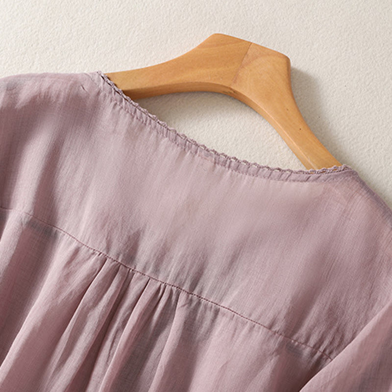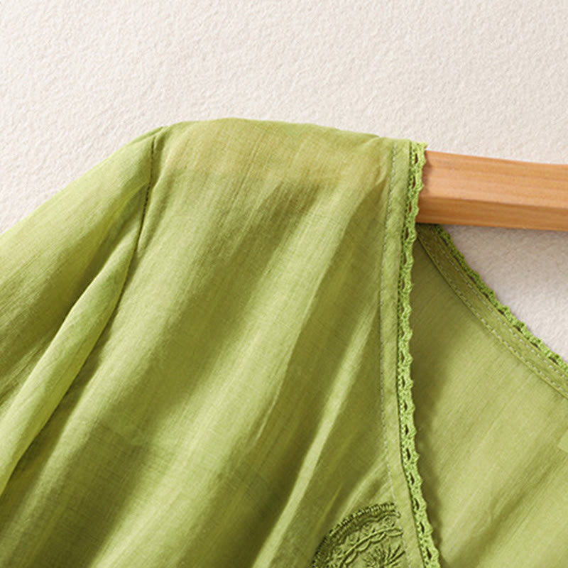 T-shirt casual da donna in cotone e lino con maniche corte, motivo ricamato con Buddha Stones scollo a V - image 10