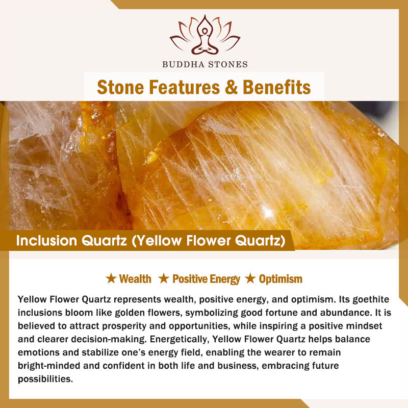 Il Quarzo Fiore Giallo rappresenta ricchezza, energia positiva e ottimismo. Le sue inclusioni di goethite sbocciano come fiori dorati, simboleggiando buona fortuna e abbondanza. Si ritiene che attiri prosperità e opportunità, ispirando al contempo una mentalità positiva e un processo decisionale più lucido. Dal punto di vista energetico, il Quarzo Fiore Giallo aiuta a bilanciare le emozioni e a stabilizzare il campo energetico, consentendo a chi lo indossa di rimanere brillante e fiducioso sia nella vita che negli affari, abbracciando le possibilità future.