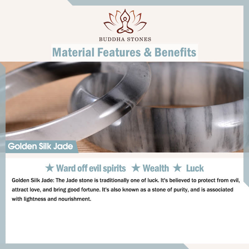 Giada di seta dorata: la pietra di giada è tradizionalmente una pietra portafortuna. Si ritiene che protegga dal male, attragga l'amore e porti fortuna. È anche conosciuta come pietra di purezza ed è associata alla leggerezza e al nutrimento.