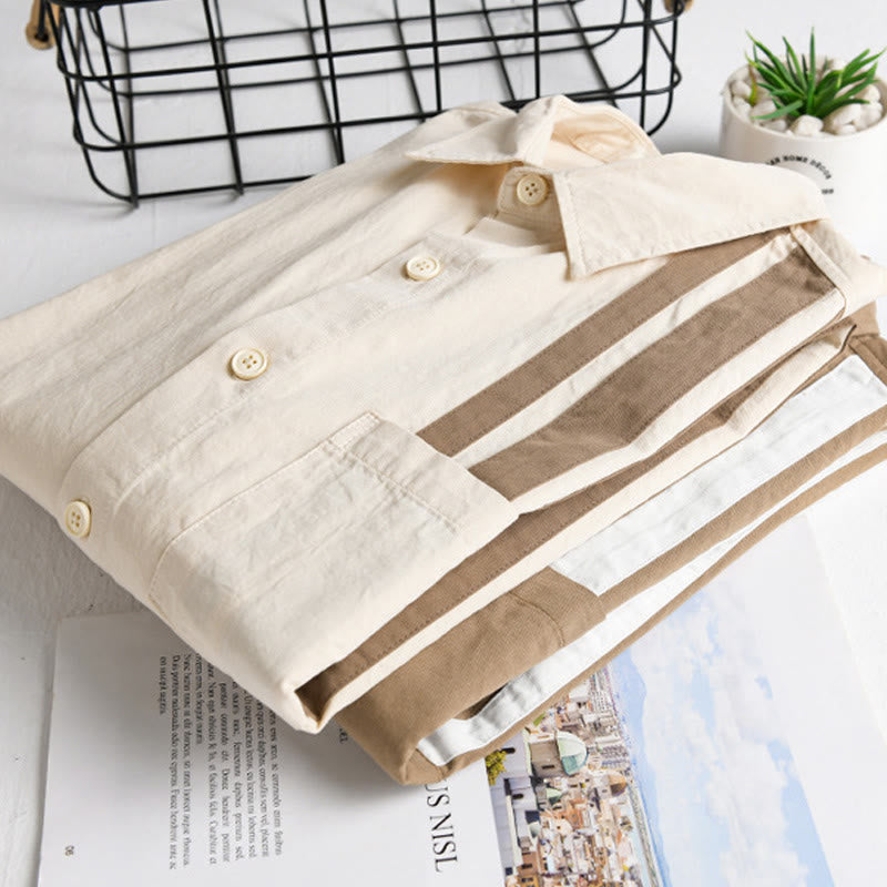 Camicia da uomo in cotone a maniche lunghe con risvolto autunnale, motivo patchwork a contrasto di colore, con tasca e Buddha Stones