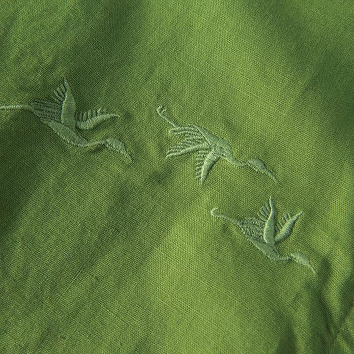 Camicia da uomo in cotone e lino con collo alto, mezza abbottonatura, motivo gru, ricamo morbido Buddha Stones