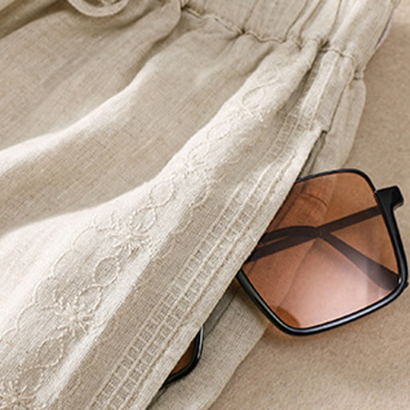 Pantaloncini da donna in cotone e lino con coulisse, motivo floreale ricamato Buddha Stones , casual, con tasche