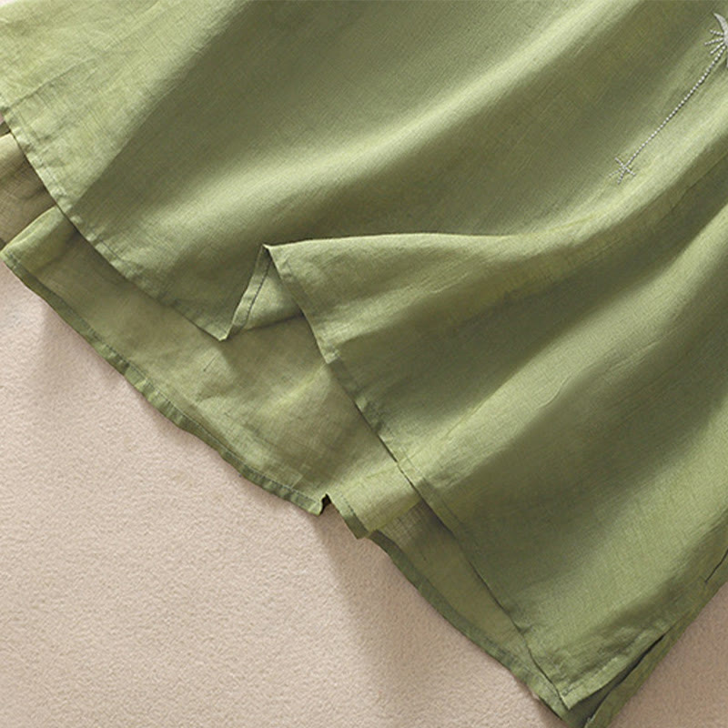 Maglietta da donna in cotone e lino con mezza manica, ricamo Buddha Stones, orlo floreale e spacco - image 18