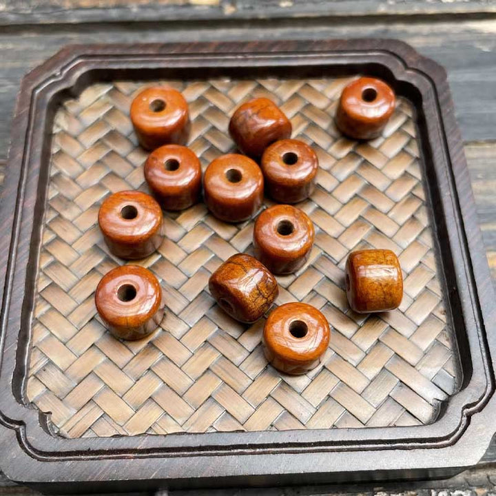 - Materiali: Perle d'osso (di provenienza agricola), perla Dzi a tre occhi, agata, corno di pecora (di provenienza agricola), agata rossa, sandalo rosso a foglia piccola, occhio di tigre, diaspro, onice nero, lega di rame.