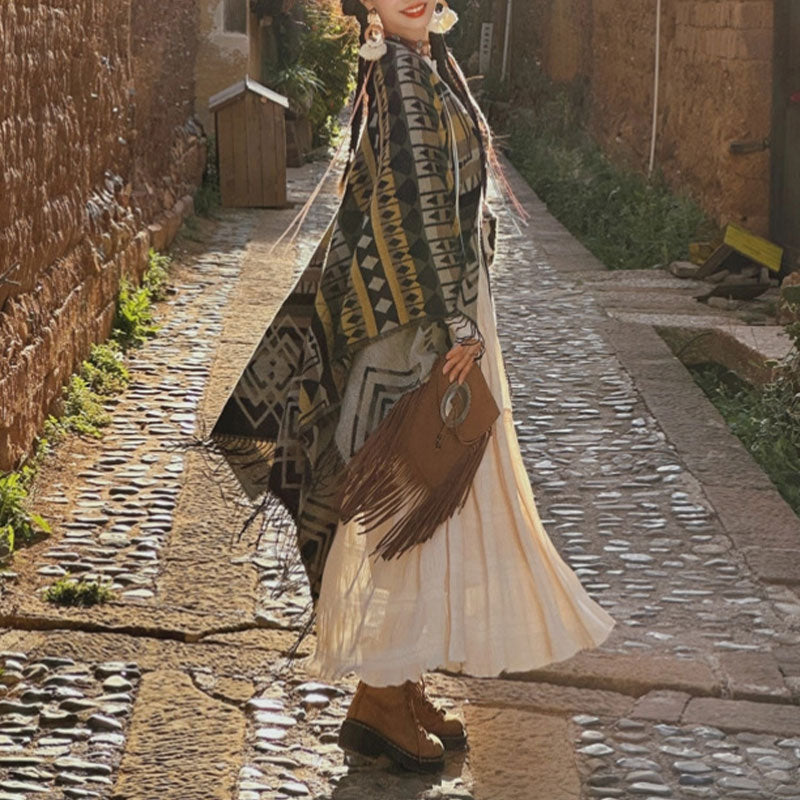 La sciarpa avvolgente con nappe con motivo geometrico di Buddha Stones è una fusione di stile e spiritualità. Questa calda sciarpa da viaggio invernale, decorata con nappe, unisce il comfort a un senso di continuità spirituale . I suoi motivi geometrici simboleggiano l' interconnessione della vita, rendendola un accessorio ideale per chi cerca calore e un ricordo dell'unità della vita .