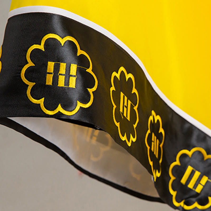 • Colori vivaci e ricami simbolici : il tessuto luminoso è abbinato a rifiniture nere e motivi ricamati di buon auspicio, che simboleggiano protezione, benedizioni e armonia spirituale.